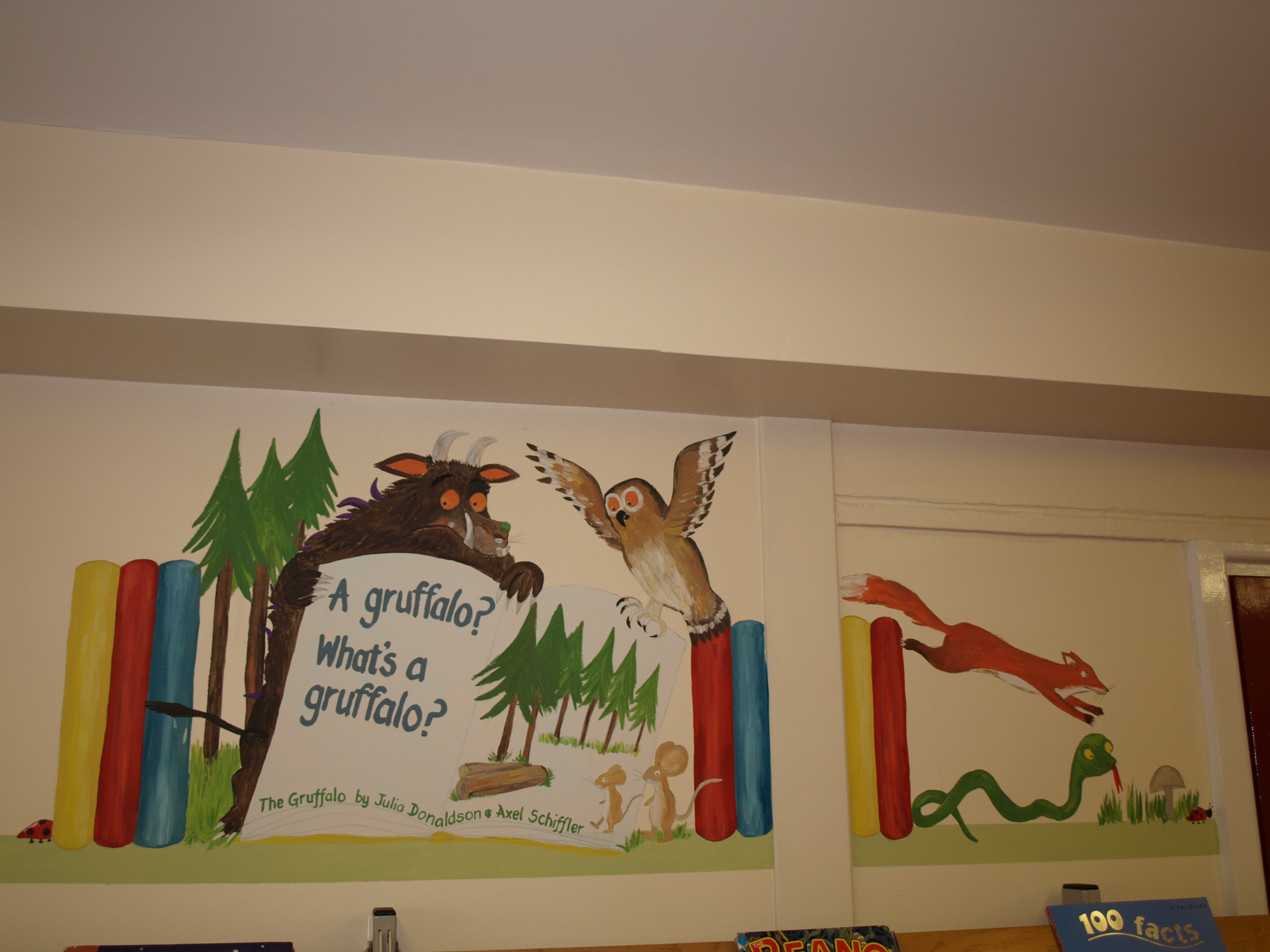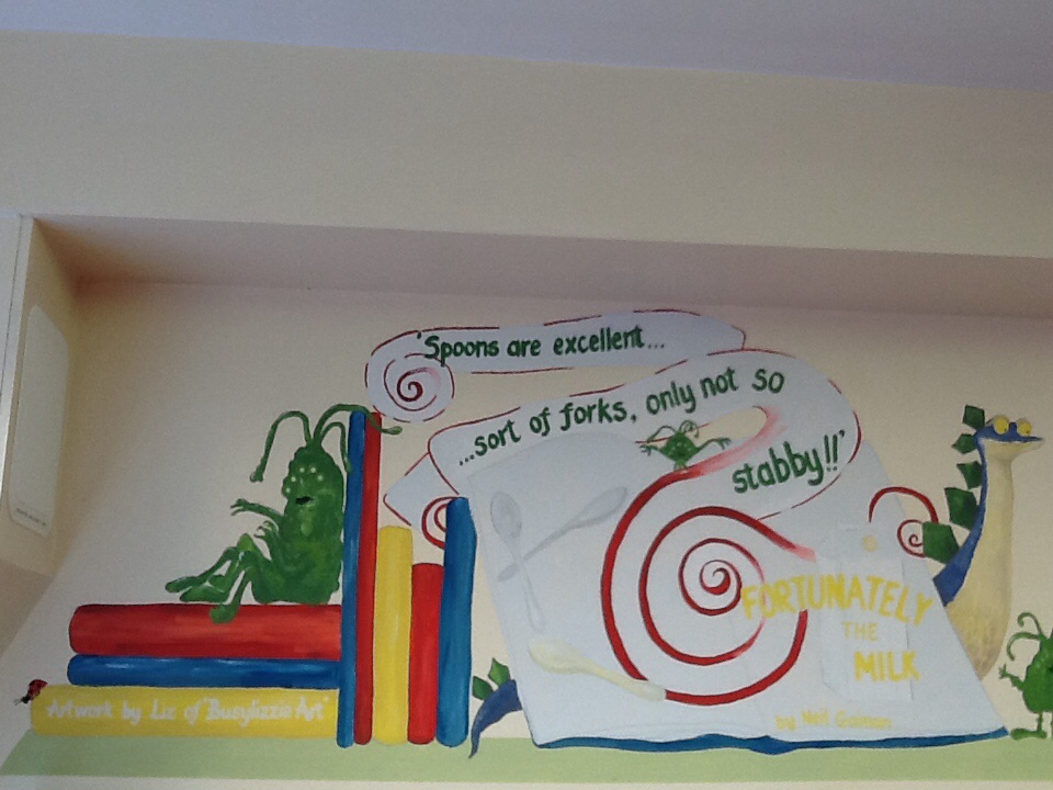 Finally, after just over 30 hours of painting, the walls of the newly located school library at Hamp Academy, Bridgwater, are complete. Chosen by the children, classic and modern fiction books are standing up or lying flopped open to reveal their characters and settings, along with a significant quotation or famous ‘line’ from their pages…. Originally written by authors as divers as Lewis Carroll and Neil Gaiman, Dr Seuss and Roald Dahl, and illustrated by ‘masters’ such as Axel Schiffler, the colourful 2015 interpretations painted by me, Liz Hutchin of Busylizzie Art, certainly bring the library alive and give the children a powerful message about books and reading….