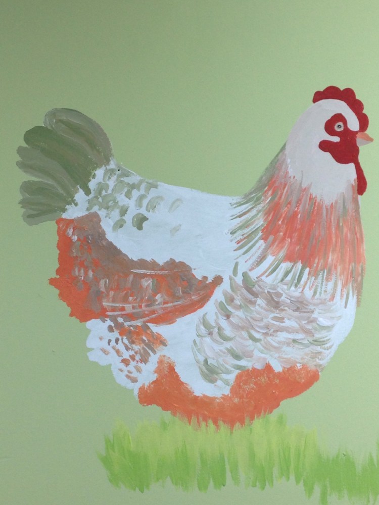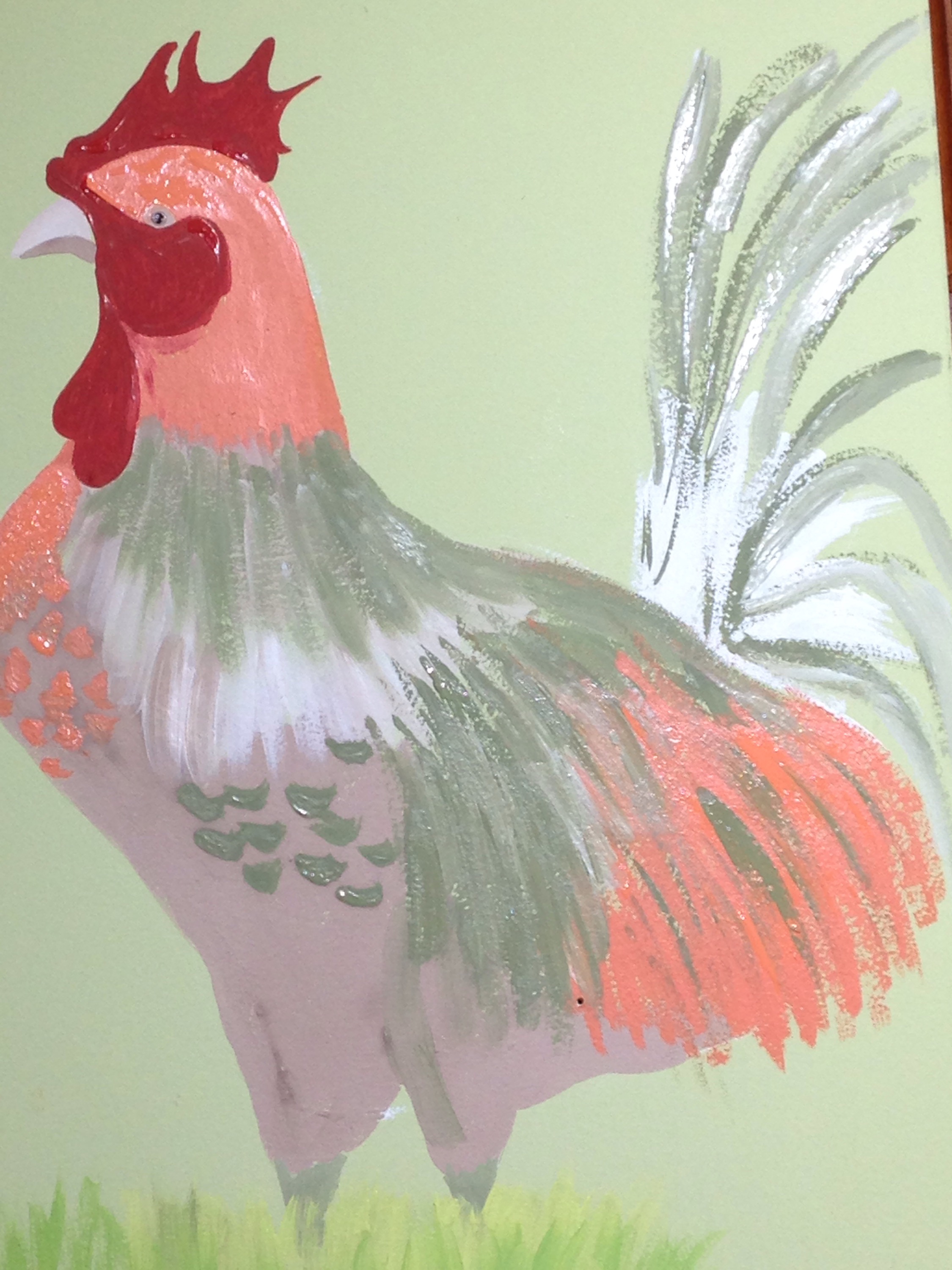 Finally getting around to painting at home, in the kitchen…. I am trying to tie together the soft pear coloured walls with the ‘dandelion clocks’ curtain fabric and my love of chickens and cockerels….