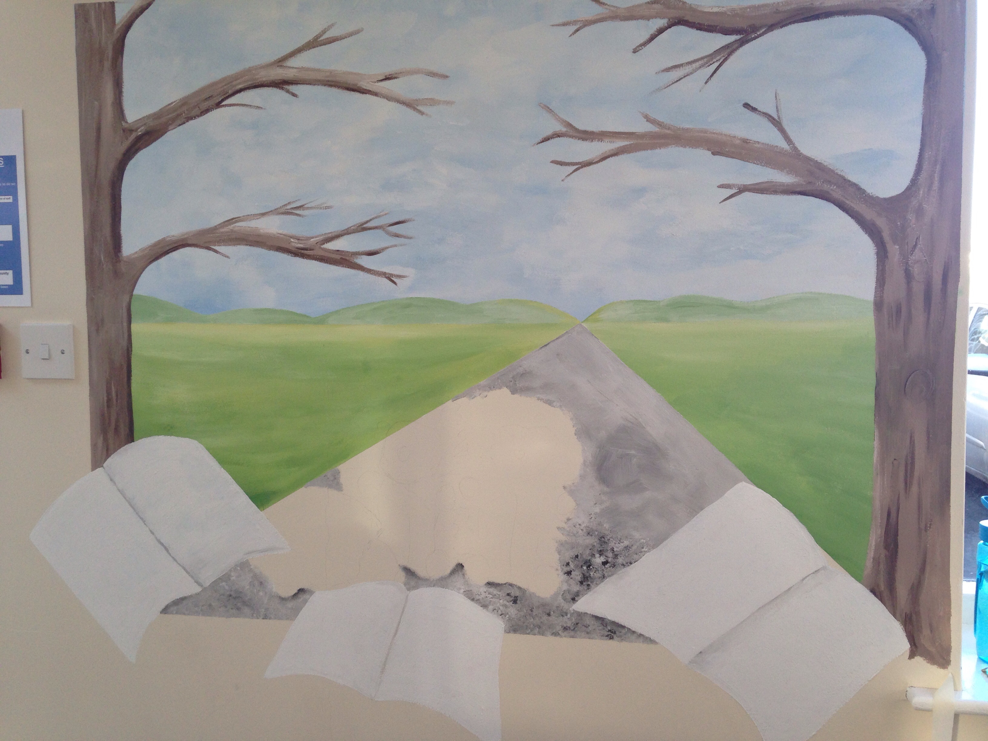 As space was limited, the area needed framing in some way and this was done with the trees and branches, but allowing the books in the foreground to just break out of the frame…