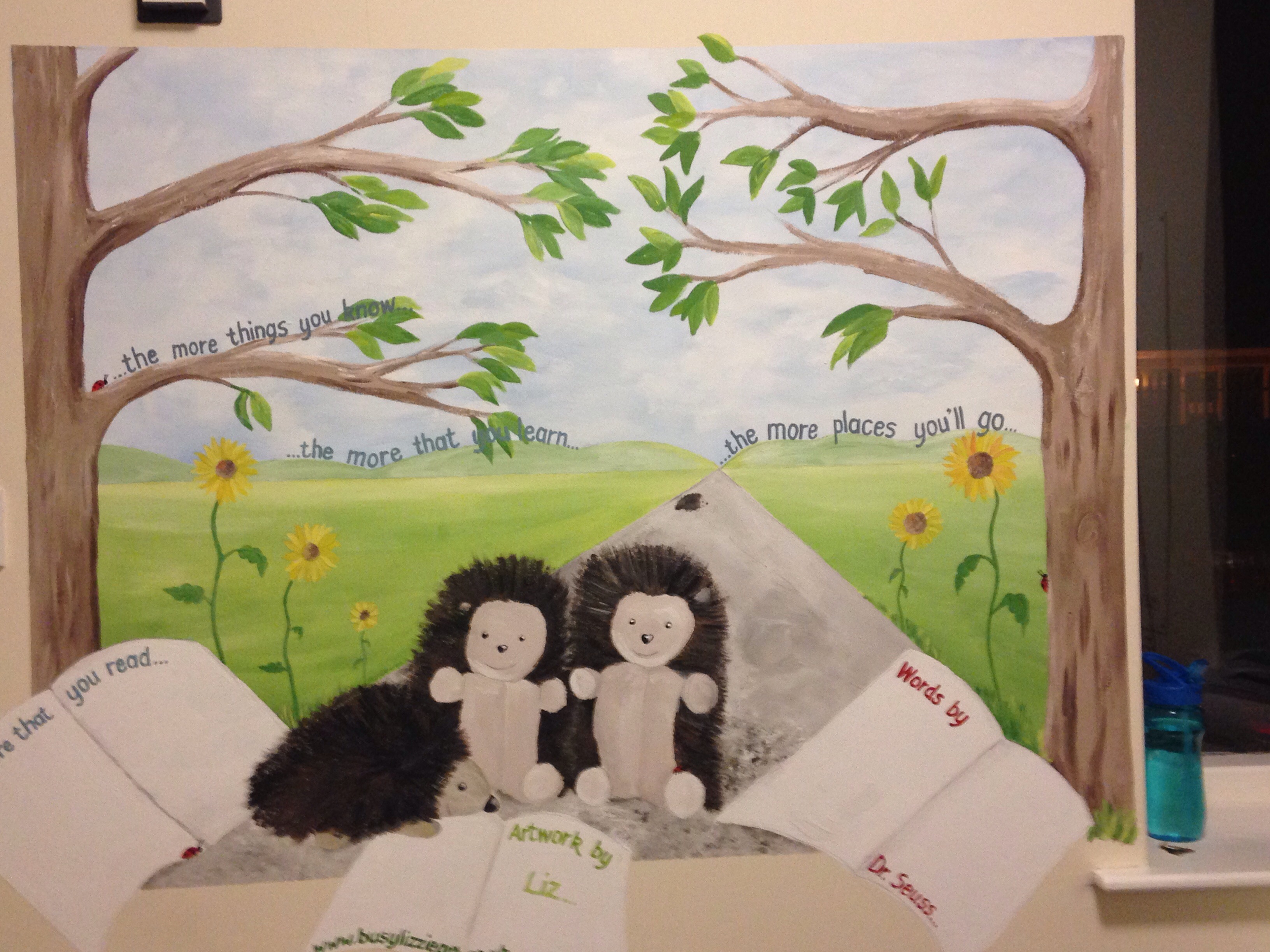 Words chosen by Karen Horsfield and the Resources for Learning staff, interpreted by Busylizzie Art as a countryside scene, where a young headgehog, under the watchful eye of two wiser friends is looking intently at a book, whilst another is travelling further on his journey along life’s pathway….
