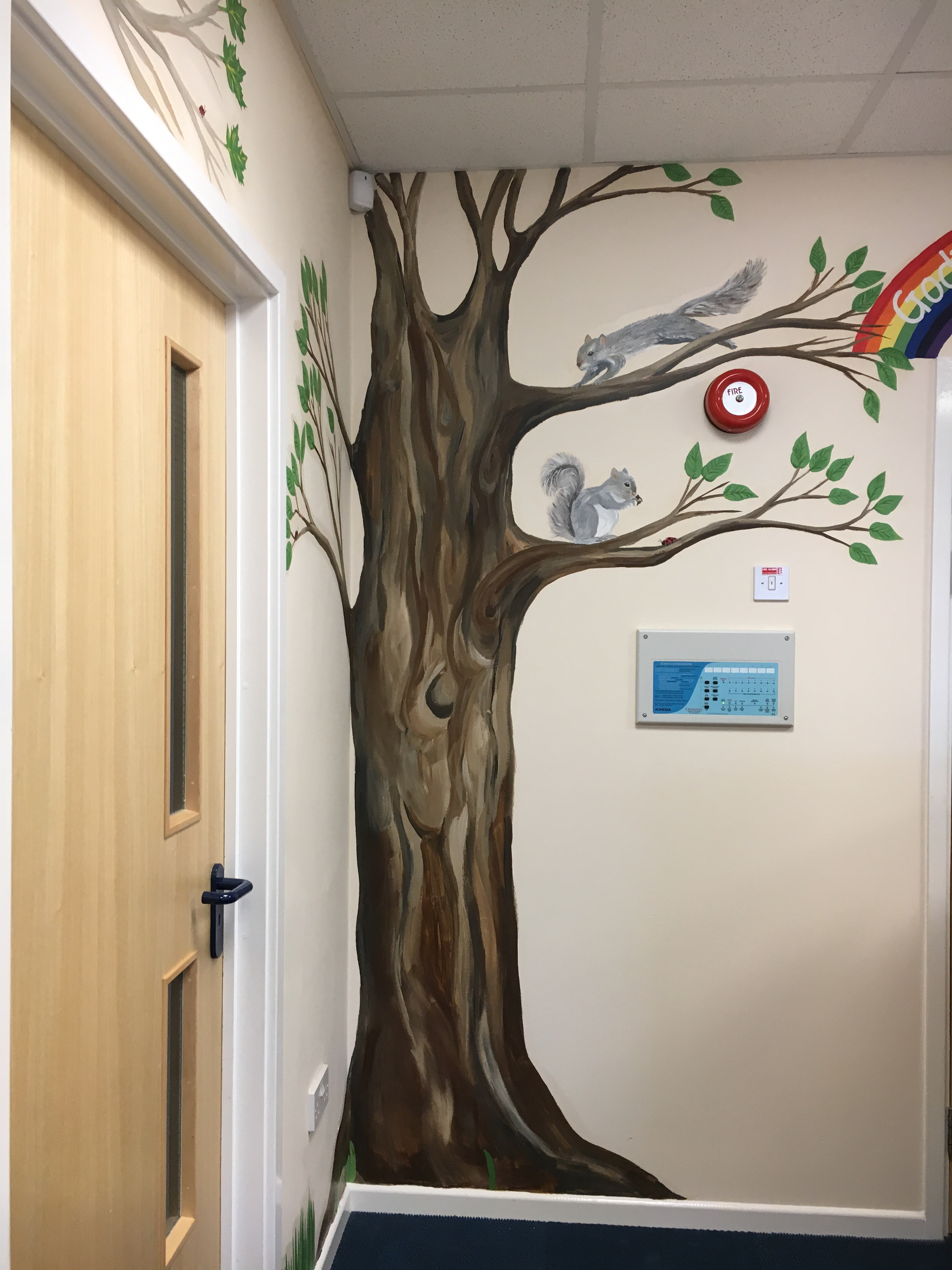 …whilst the KS1 foyer at Combe St Nicholas Primary School near Chard, has been transformed into a woodland setting, incorporating all four trees of the school house system, woodland creatures representing the classes and their sunflower…