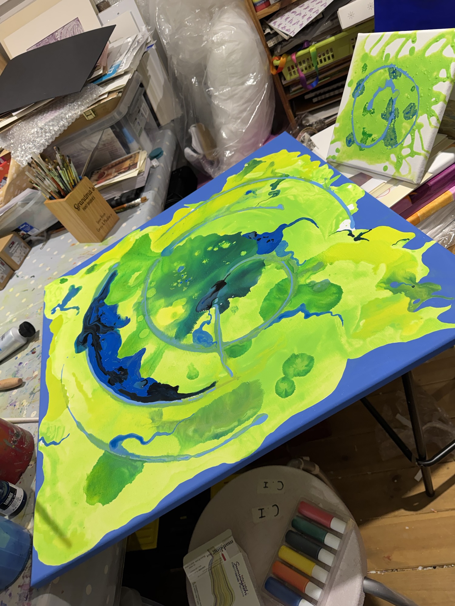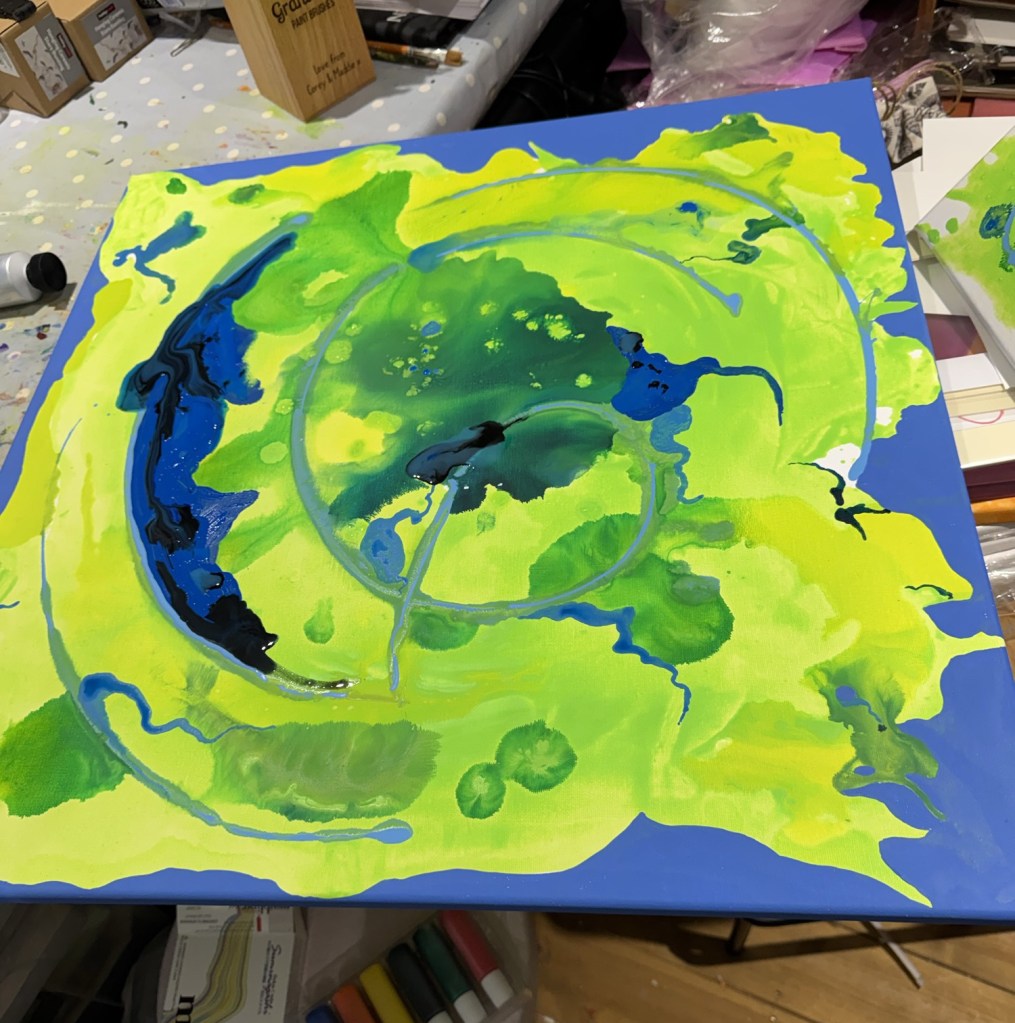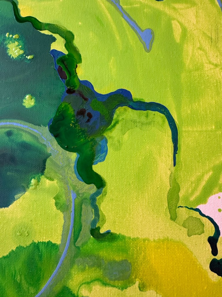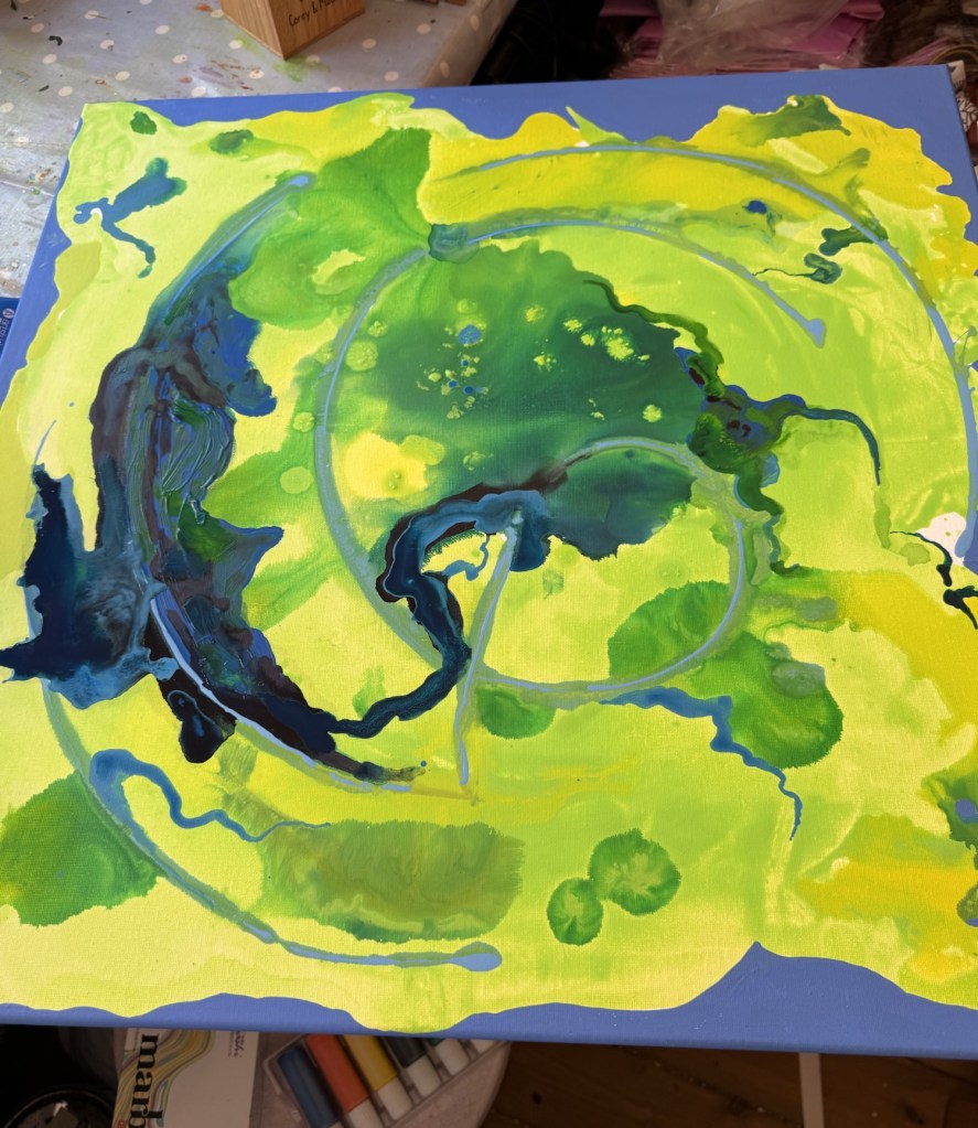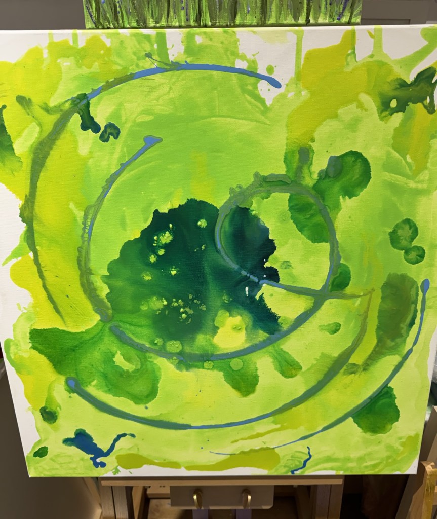 Choosing the green of a spring morning dancing, the green of newly unfurled hydrangea leaves…adding a touch more yellow then combining with pouring medium, stirring carefully to squash the lumps of pigment…taking the largest available canvas in the studio, adding water to its surface, then watching the beautiful colour find its way as I pour gently onto the surface, slowly.