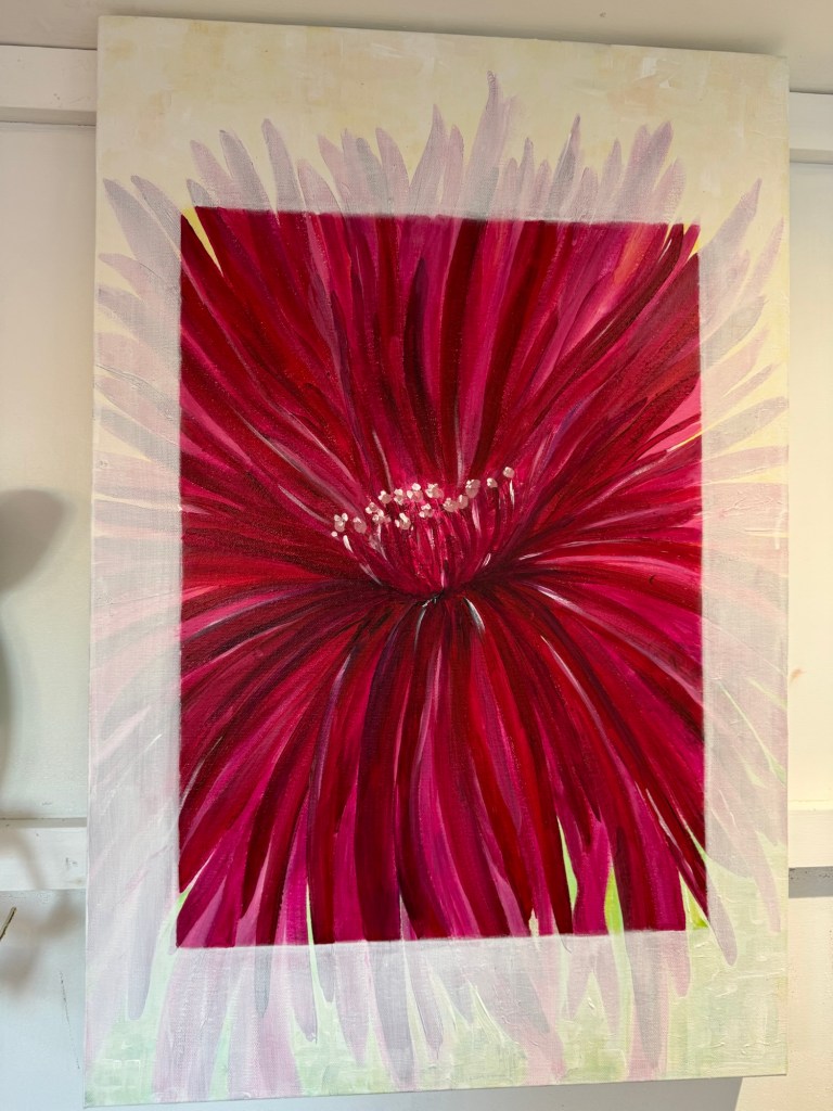 Beautiful deep pink/red chrysanthemum head with veiled mount painted over. This deep edged canvas measures approximately 500x700mm £350 (unframed)