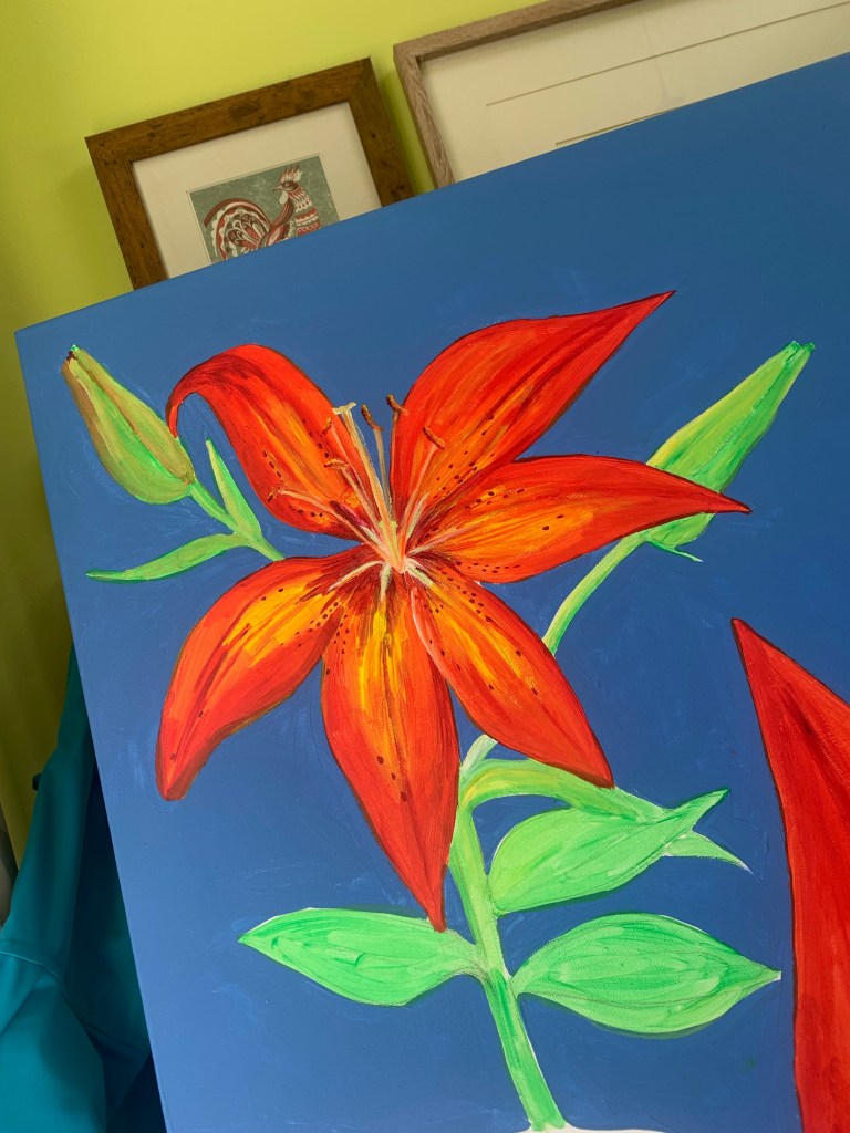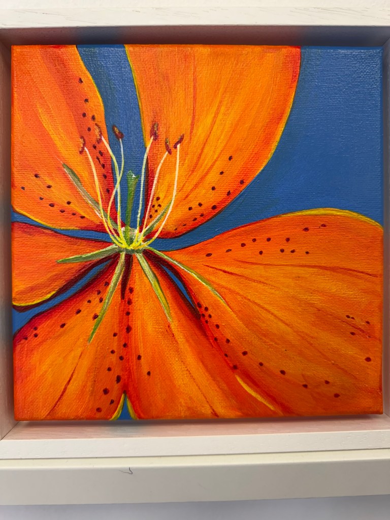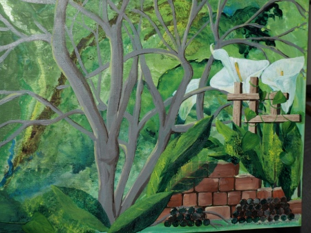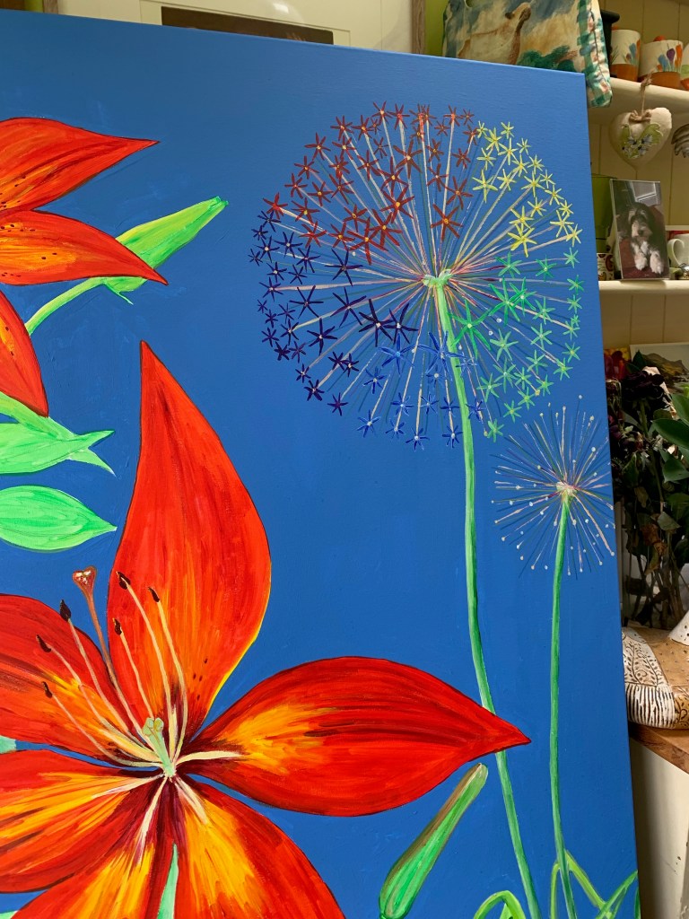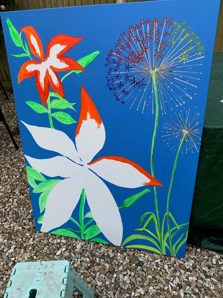 It started out as a canvas of ‘two halves’ – one which allowed glimmers of hope and a positive outcome after the confinement, with brighter colours and flowers and fruits of labours…and the other, which was the walls, fencing, restriction, dominated by the strong branches of the fig tree. Part way through working on the canvas actually in the garden, I noticed in our next-door neighbour’s garden, the calla lilies were in abundance – their statuesque beauty just had to be captured on my canvas; they seemed to be forcing their strength and elegance through the walls and fencing. Previously, this side of the canvas was quite grey and austere, with the strong but rambling sky-seeking fig branches, bobbled with new fruit, the addition of the lilies successfully drew the attention.