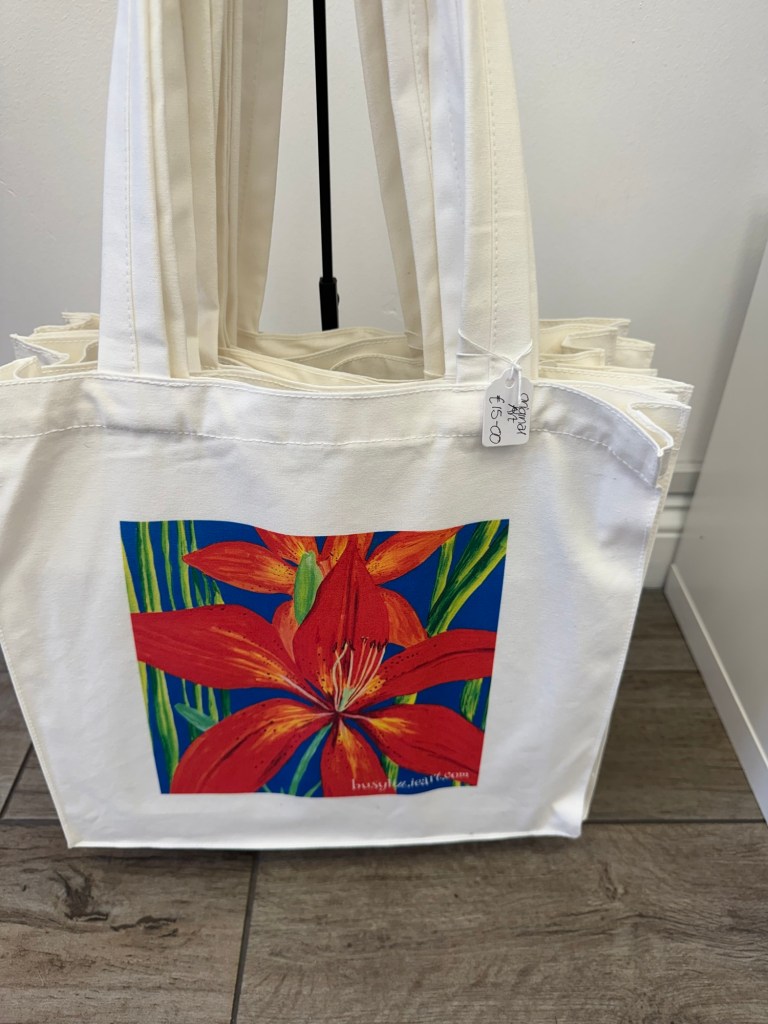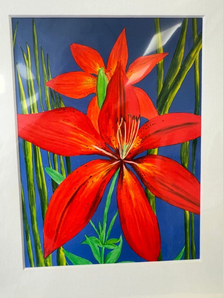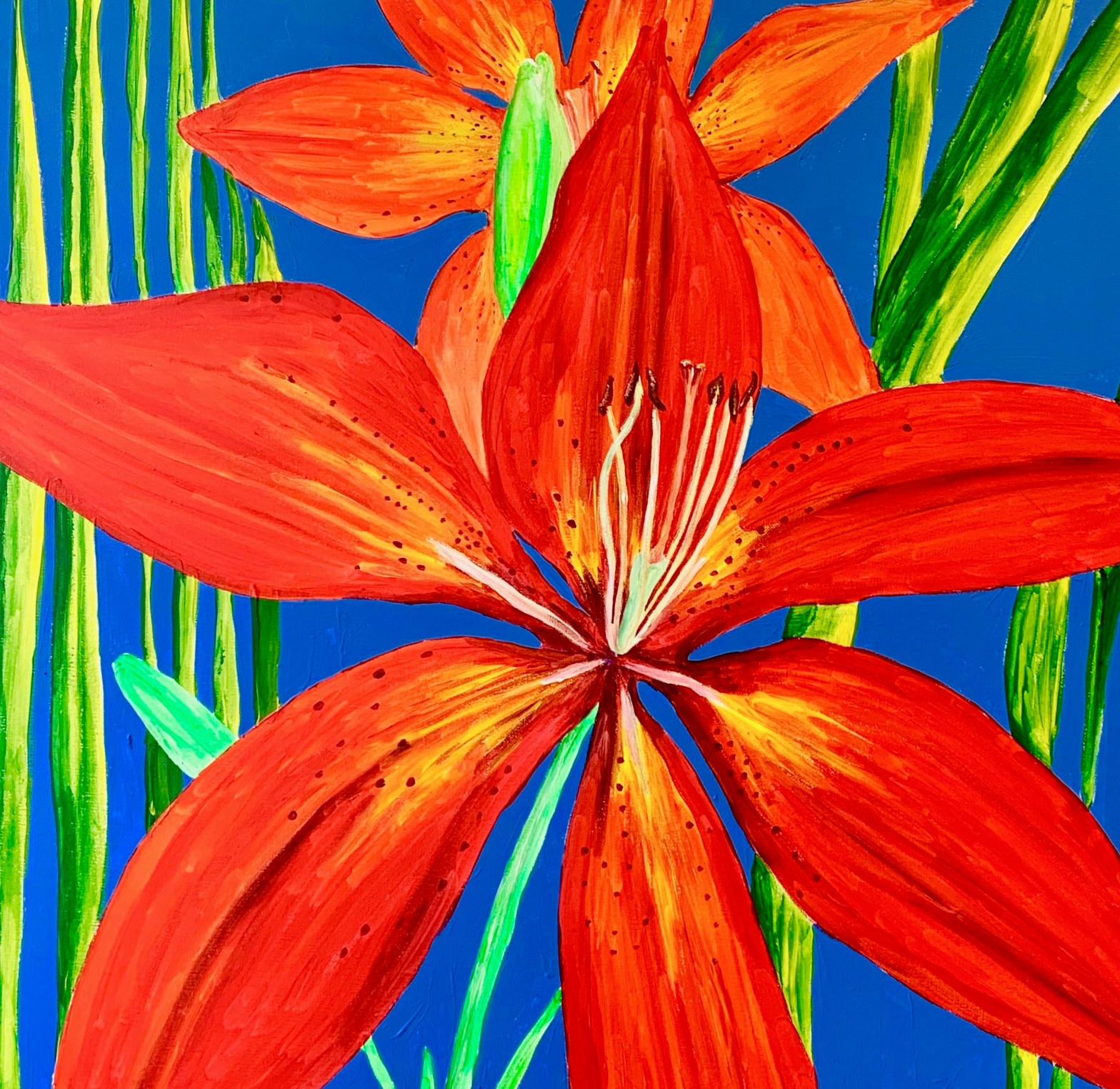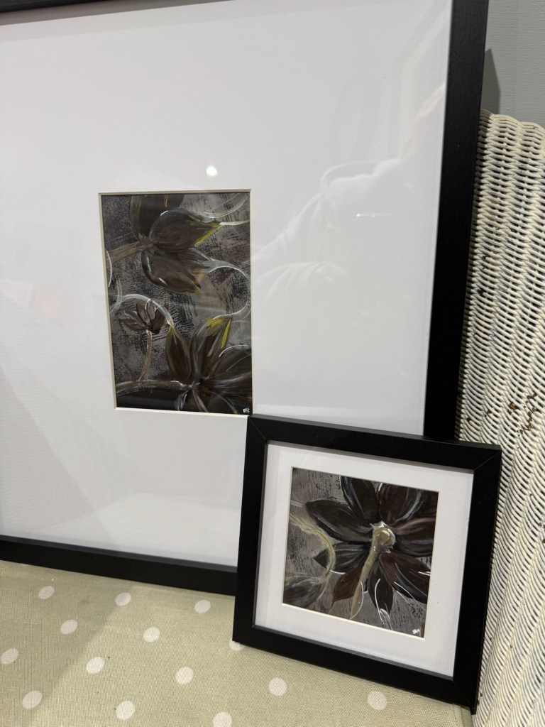 It started out as a canvas of ‘two halves’ – one which allowed glimmers of hope and a positive outcome after the confinement, with brighter colours and flowers and fruits of labours…and the other, which was the walls, fencing, restriction, dominated by the strong branches of the fig tree. Part way through working on the canvas actually in the garden, I noticed in our next-door neighbour’s garden, the calla lilies were in abundance – their statuesque beauty just had to be captured on my canvas; they seemed to be forcing their strength and elegance through the walls and fencing. Previously, this side of the canvas was quite grey and austere, with the strong but rambling sky-seeking fig branches, bobbled with new fruit, the addition of the lilies successfully drew the attention.