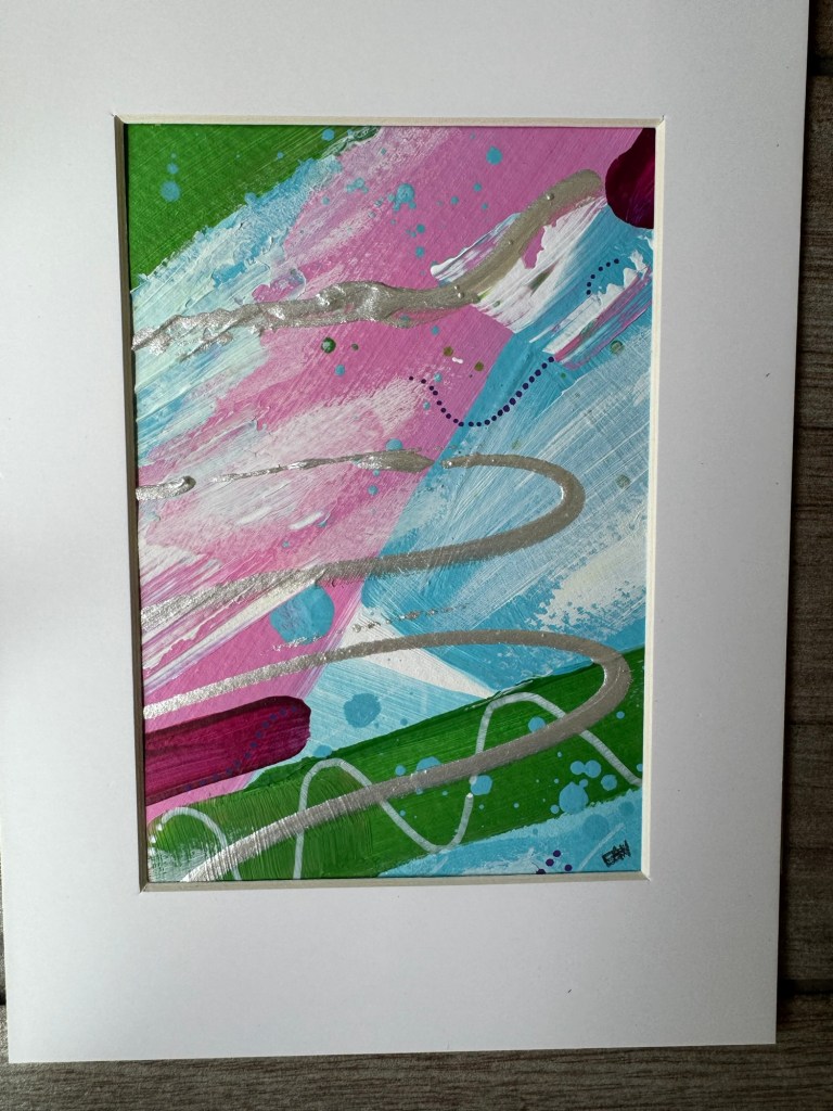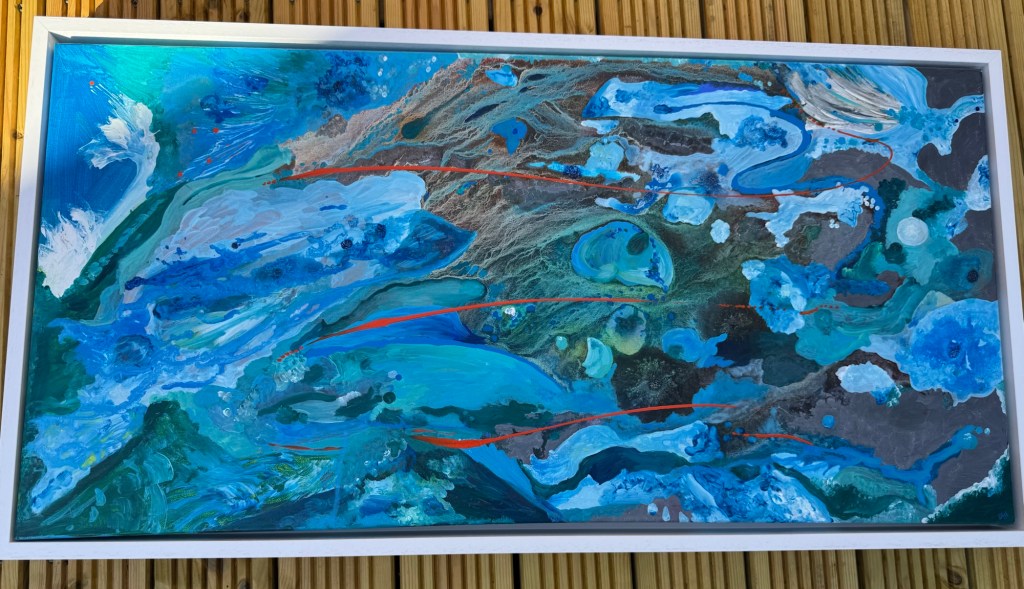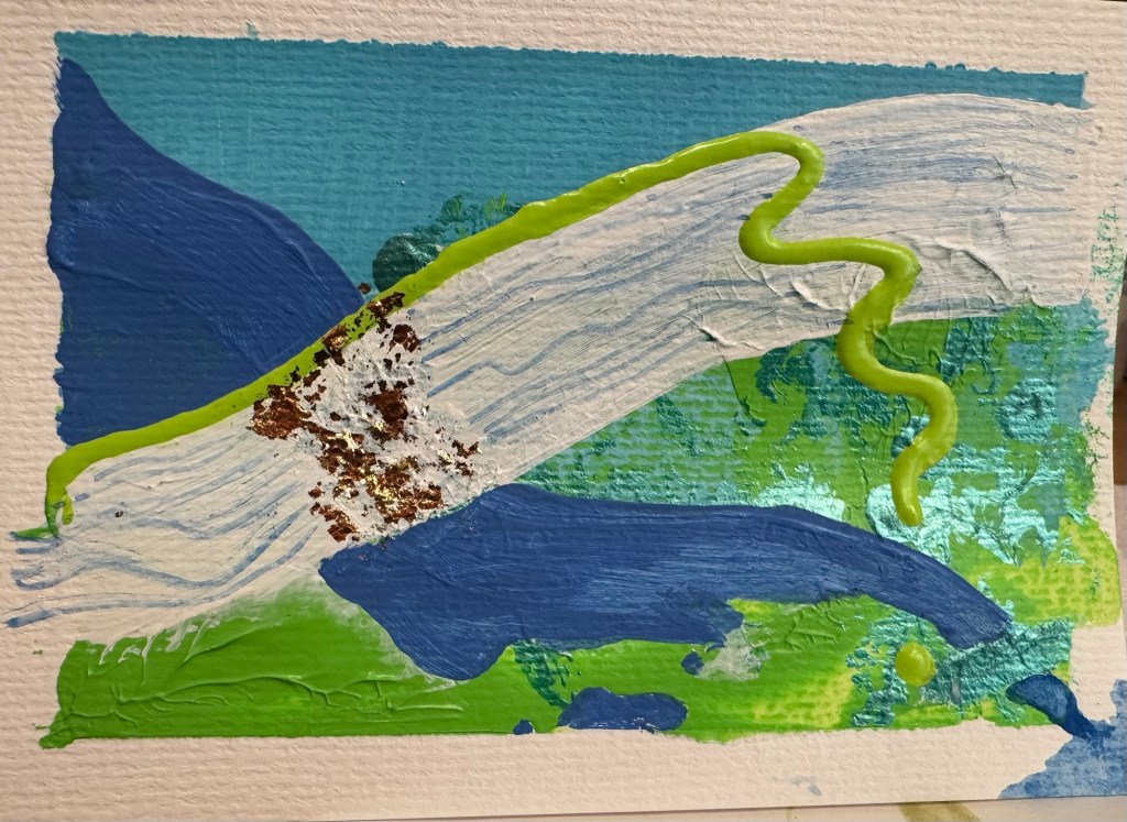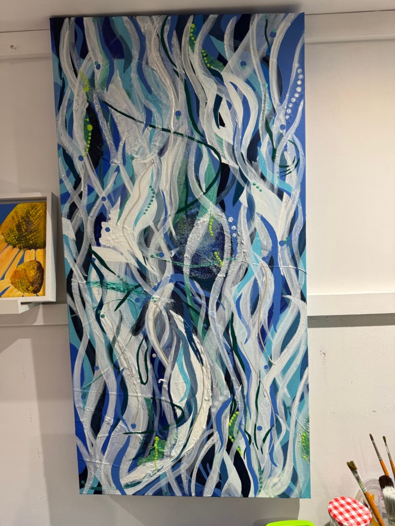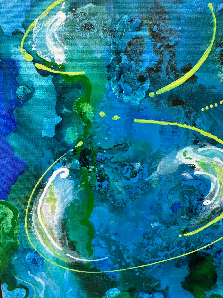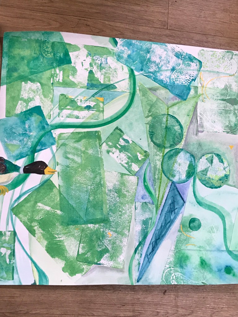 Focussing on the garden as a green tranquil space and soaking up the sunlight is the tonic we have needed to live through this pandemic. I have been feeling serenely calm, strangely strong and have experienced an amazing sense of freedom to create during these unprecedented times. Recreating this, representing this in some form of ‘art’ has been an incredibly cathartic process; a previously discarded canvas, the only large one available, was what triggered off the work…the layering process began as my thoughts and feelings emerged, rolled around my head and emerged in some swathe of acrylic paint, flowing ink, soluble. Pastels, masking tape, colour, the movement and lots of experimenting and tweaking, working and reworking…