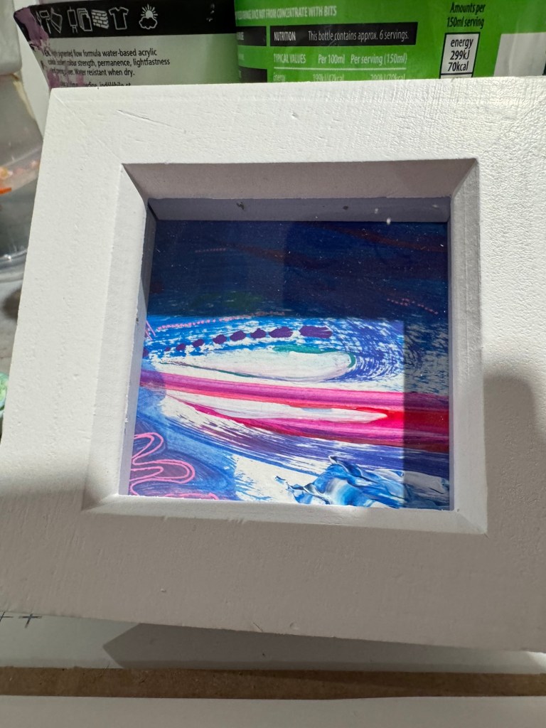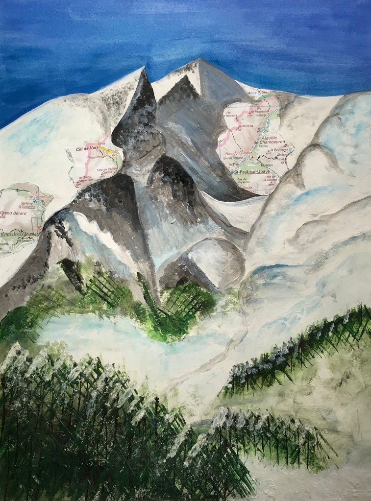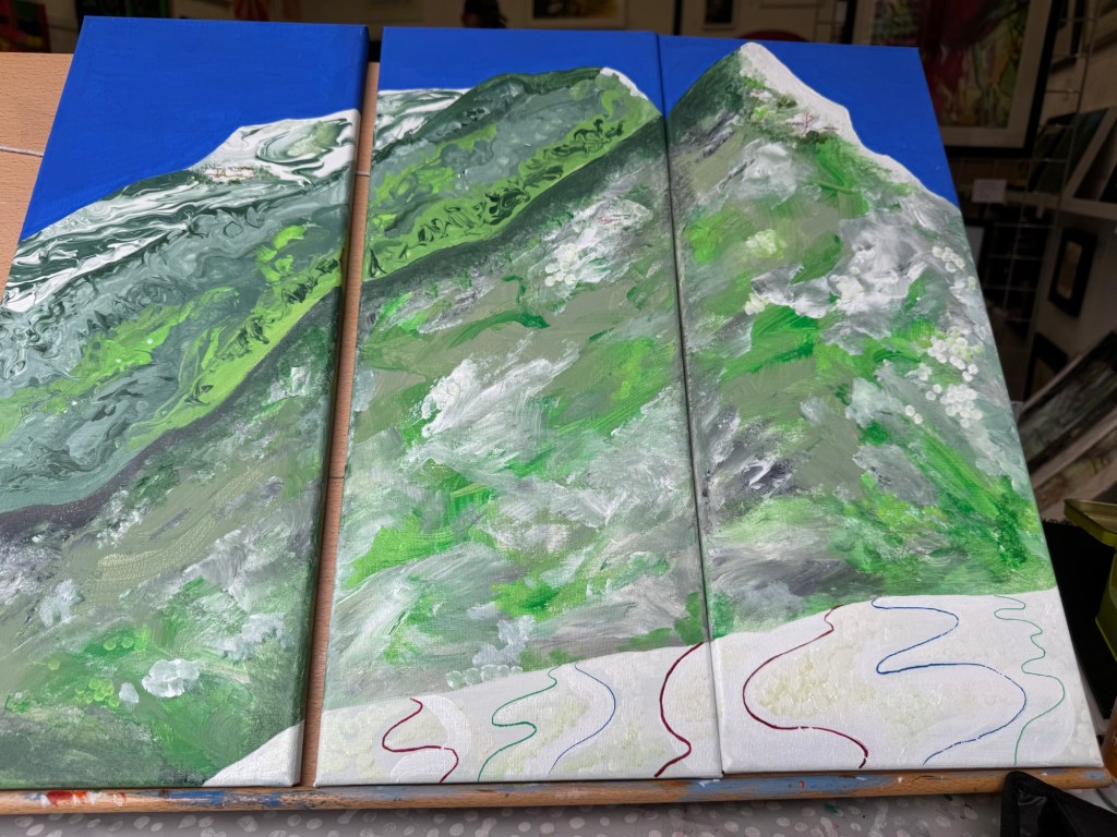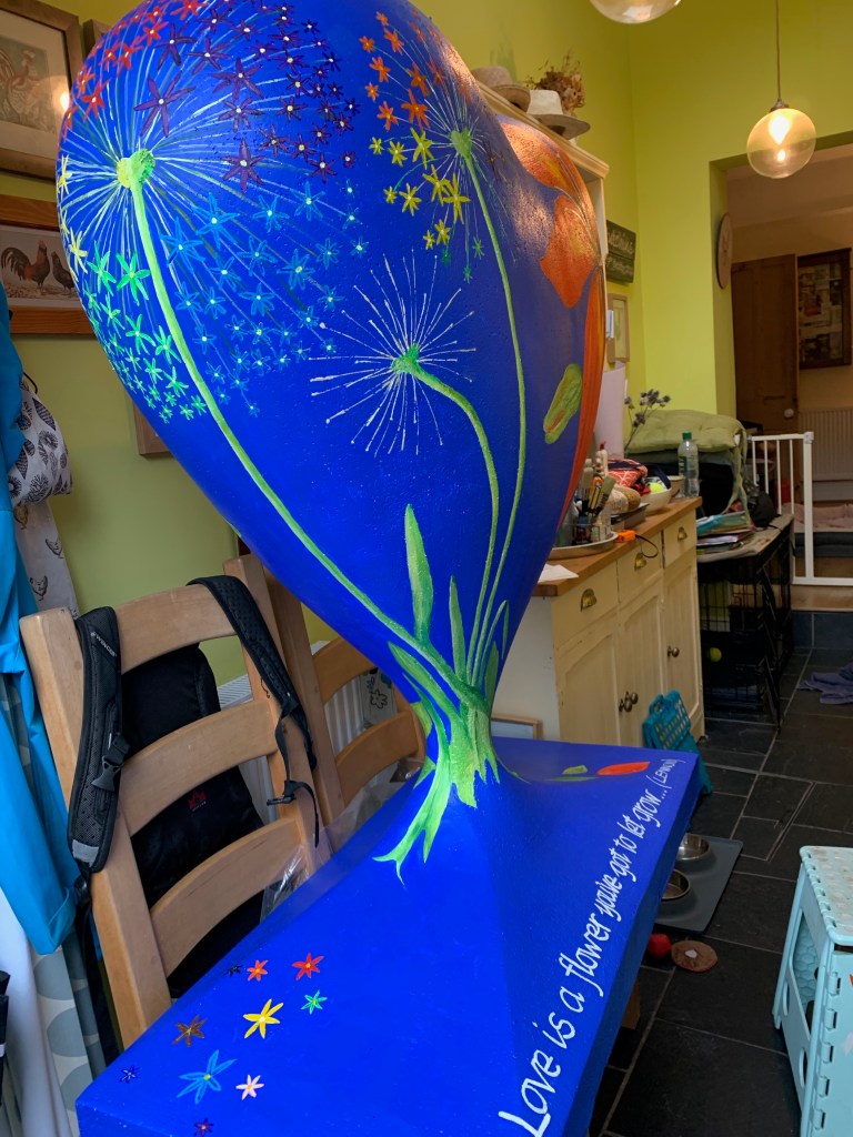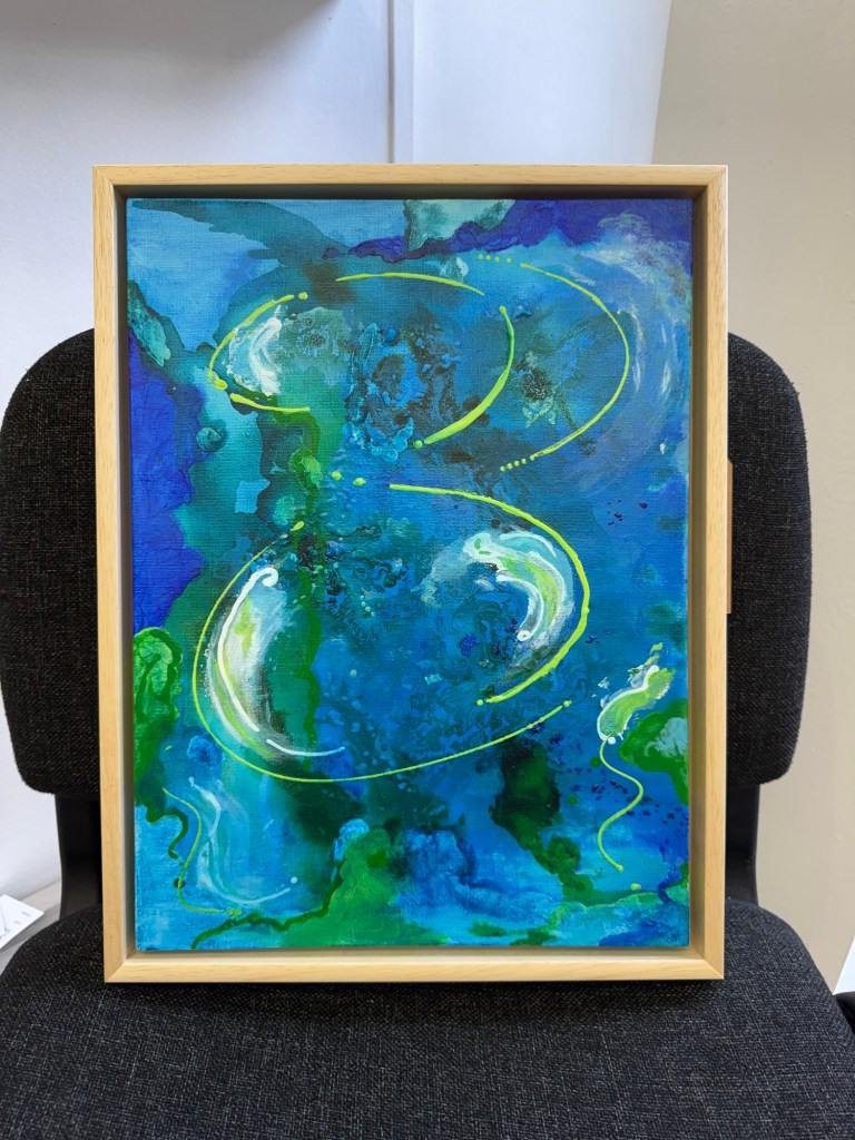 Focussing on the garden as a green tranquil space and soaking up the sunlight is the tonic we have needed to live through this pandemic. I have been feeling serenely calm, strangely strong and have experienced an amazing sense of freedom to create during these unprecedented times. Recreating this, representing this in some form of ‘art’ has been an incredibly cathartic process; a previously discarded canvas, the only large one available, was what triggered off the work…the layering process began as my thoughts and feelings emerged, rolled around my head and emerged in some swathe of acrylic paint, flowing ink, soluble. Pastels, masking tape, colour, the movement and lots of experimenting and tweaking, working and reworking…