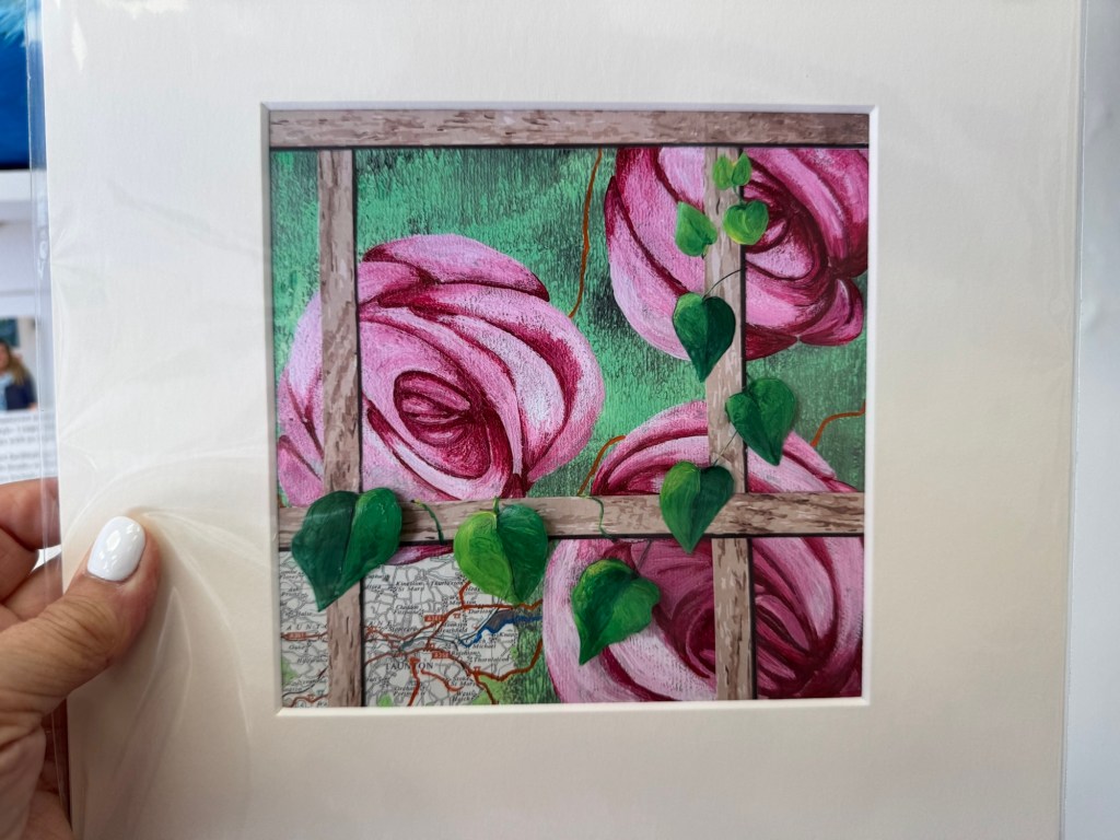 So, spring pushes on, the fig branches begin to be covered in pale green hands unfurling and growing daily in size to create cool shade, and the canvas comes together too. Layers are added, shade emphasized and light accentuated and an out-of-season, but colourful tea-rose further symbolising the hope and positivity that is felt in the garden. Foliage -painted, printed, collaged adds to the foreground and bindweed (painted on plastic, cut and attached to painted fishing line) inevitably entwines itself around the most beautiful of flowers, imposing its restrictions, llike the restriction we too are feeling at the prospect of another three weeks of ‘lockdown’.
