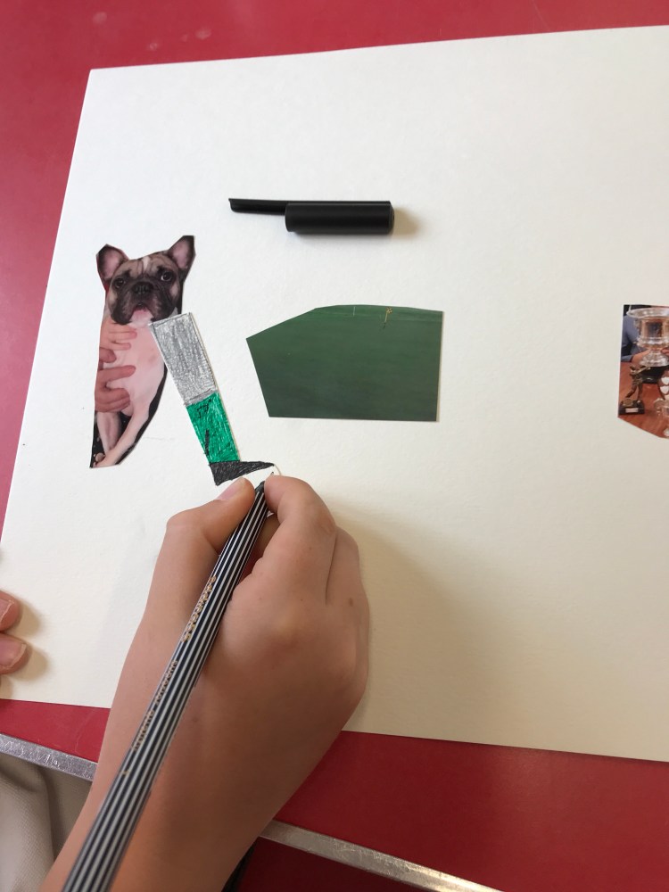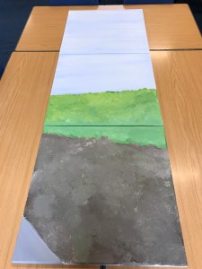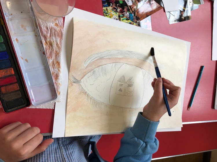 Beginning by watching a film of the man himself, David Hockney, starting a painting across two canvases, the children learned how to plan their space looking at their scene and marking in key elements and using masking tape to guide their first paint marks.