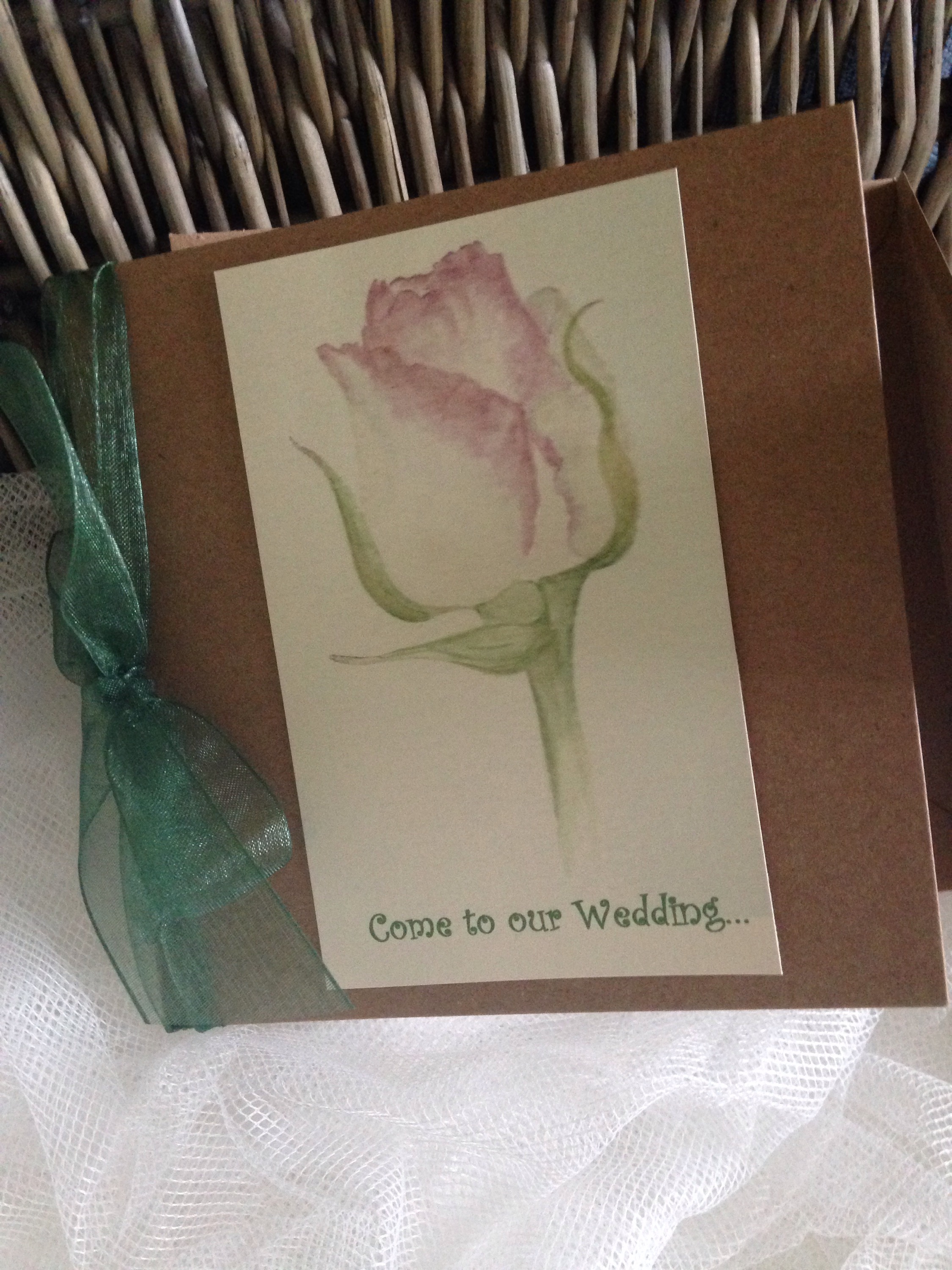 50 Invites, details printed on insert, 13 x 13cm card with envelopes plus organza ribbon, all hand-made using an existing painting, all for £200. (Over 50 charged pro-Rata)