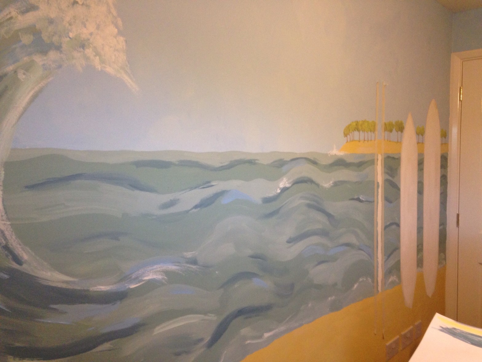Having completed the preliminary art work for this commission, I set to work on Tuesday with the background colour, sky, but encountered several obstacles on the way…. That moment I began to paint, I just knew the colour was just not right….I kept on painting a bit more, then a bit more and then stopped…Continue reading “Surf bedroom takes shape…”